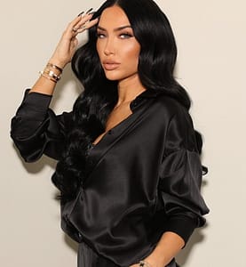 Tiesi’s soft glam “casual” black satin outfit is perfect for WFH days when you still want to look professional. She chose to go monochromatic from head to toe in this all-black look, which we absolutely love.