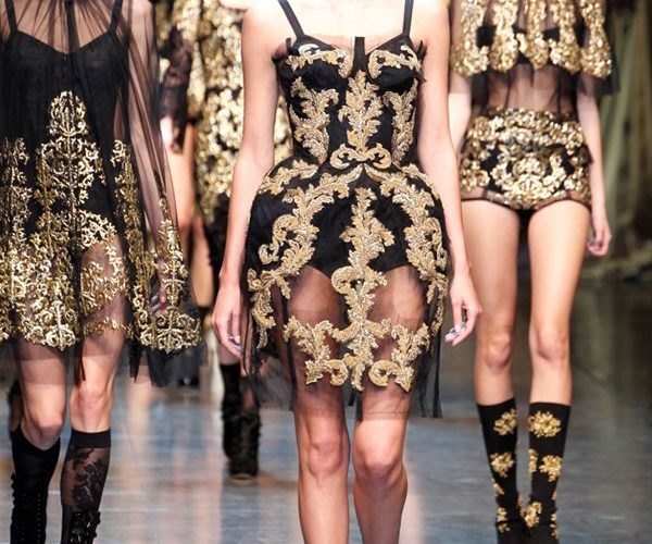 In fashion, these ideas translate through embroidery, embellishment, and richly textured fabrics. Designers like Dolce & Gabbana often draw from this visual language, using gold threadwork, beading, and intricate appliqué to create depth and dimension.