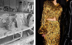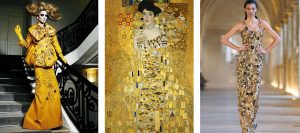 That approach translates naturally into fashion through embroidery and embellishment. Designers may take cues from his work by incorporating gold thread, mosaic-like beading, and densely patterned fabrics that sit close to the body. Houses like Dior and Dolce & Gabbana have explored similar territory, using surface decoration to create garments that feel rich and dimensional without relying heavily on structure.