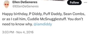 As noted in the above TikTok video (@wffnews), Ellen and Diddy have been friends in the past, as she has tweeted a birthday shoutout for him that has since gone viral.