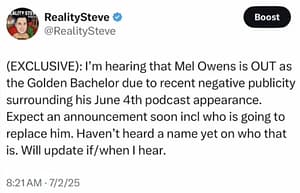Reality TV commentator Reality Steve reported that Owens has been removed from his role due to the negative publicity, writing, “Mel Owens is OUT as the Golden Bachelor … Expect an announcement soon including who is going to replace him.” (here)