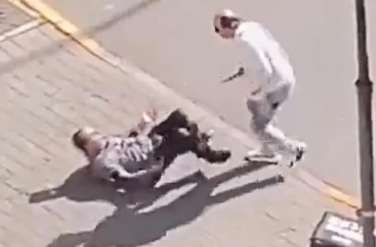 This footage seems to depict a man being repeatedly stabbed in the shoulder and chest by another individual armed with a knife. The victim subsequently fell to the ground, and the assailant fled the scene, leaving behind what appeared to be bloodstains.