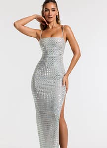 This silver evening gown by Oh Polly features a thigh-high side split just like Jen’s look! We also love how this embellished piece includes stunning mirrored detailing making this a show-stopping piece for any occasion.