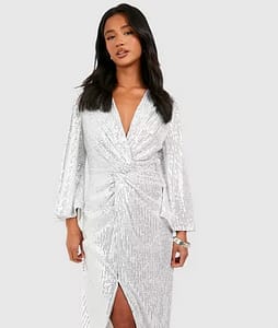 This long-sleeved silver sequin dress is perfect for rocking during the cooler months. It features knot detailing in the front and a gorgeous slit which adds the ideal amount of drama to this look!