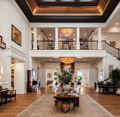 At roughly 38,000 square feet, the main living areas are equally commanding. From the moment you enter, the scale is unmistakable — soaring ceilings, gallery-style hallways, and rooms designed to host everything from intimate gatherings to black-tie events.