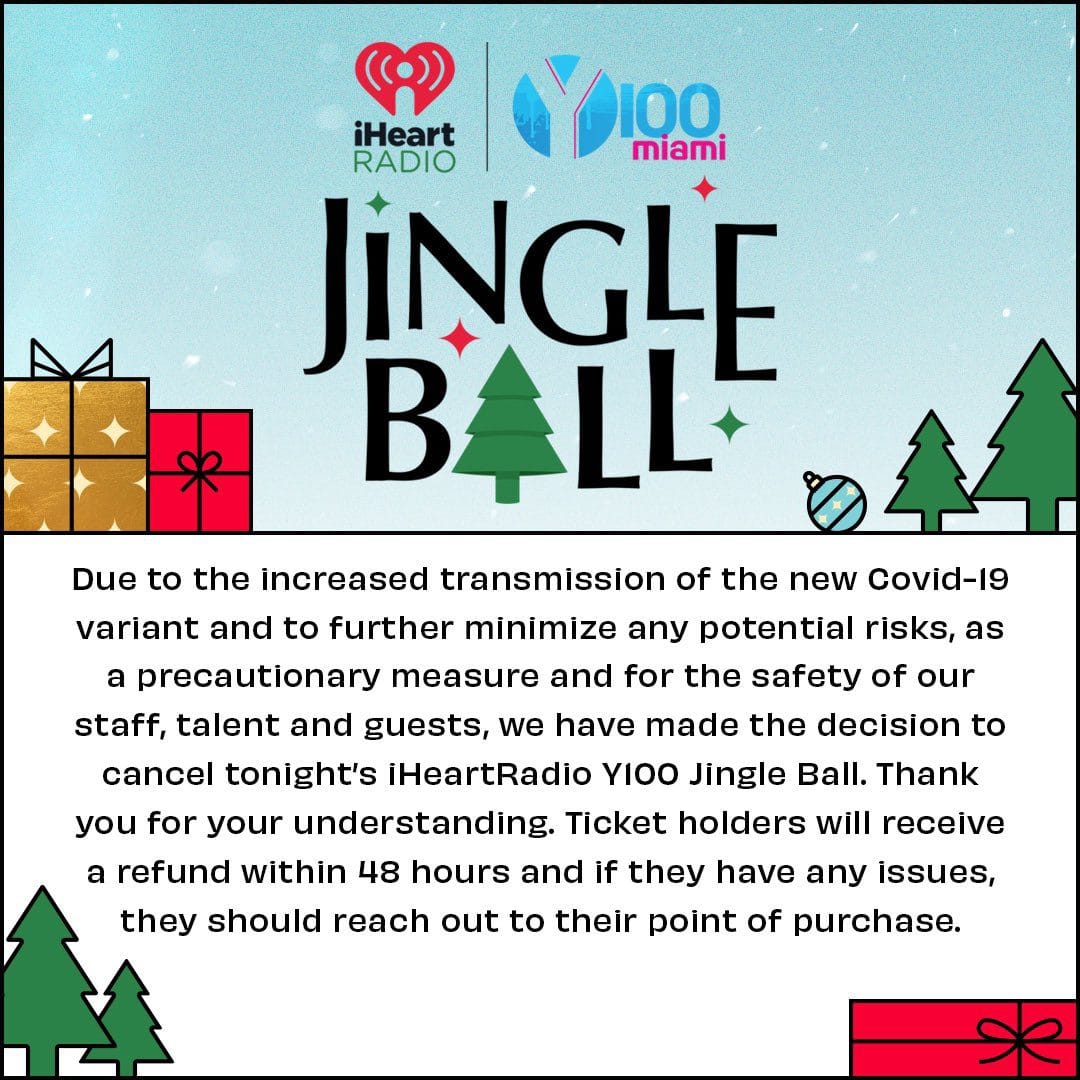 In a statement posted on Twitter on Sunday, iHeartRadio wrote, “Due to the increased transmission of the new Covid-19 variant and to further minimize any potential risks, as a precautionary measure and for the safety of our staff, talent and guests, we have made the decision to cancel tonight’s iHeartRadio Y100 Jingle Ball. Thank you for your understanding. Ticket holders will receive a refund within 48 hours and if they have any issues, they should reach out to their point of purchase.”