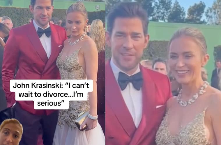 According to this TikTok video posted by user @thekylemarisa, there is a viral clip floating around that seemingly shows actor John Krasinski allegedly stating, “I can’t wait to divorce,” while standing arm and arm at the Golden Globes with his wife Emily Blunt.