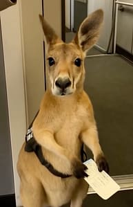 Now-viral footage of an alleged kangaroo, dressed in a harness, seemingly standing in line at an airport with a boarding pass in hand (here).