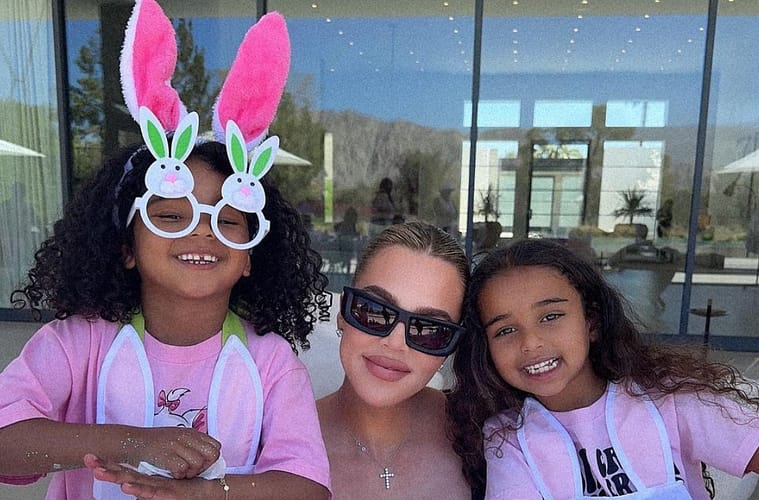 Khloé Kardashian posted pictures of her four-year-old daughter True, who was decked out for Easter in a baby pink Gucci outfit, pink bunny ears, a nameplate necklace with a bejewelled “True” on it, and a cross pendant necklace. She also included images of the baby cousins gathering around an outdoor table painting their own Easter eggs in a different post.
