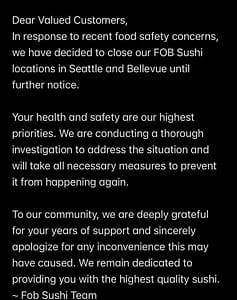 FOB Sushi has released a new statement (here) alleging that they have closed their Seattle and Bellvue locations following the recent food safety concerns.
