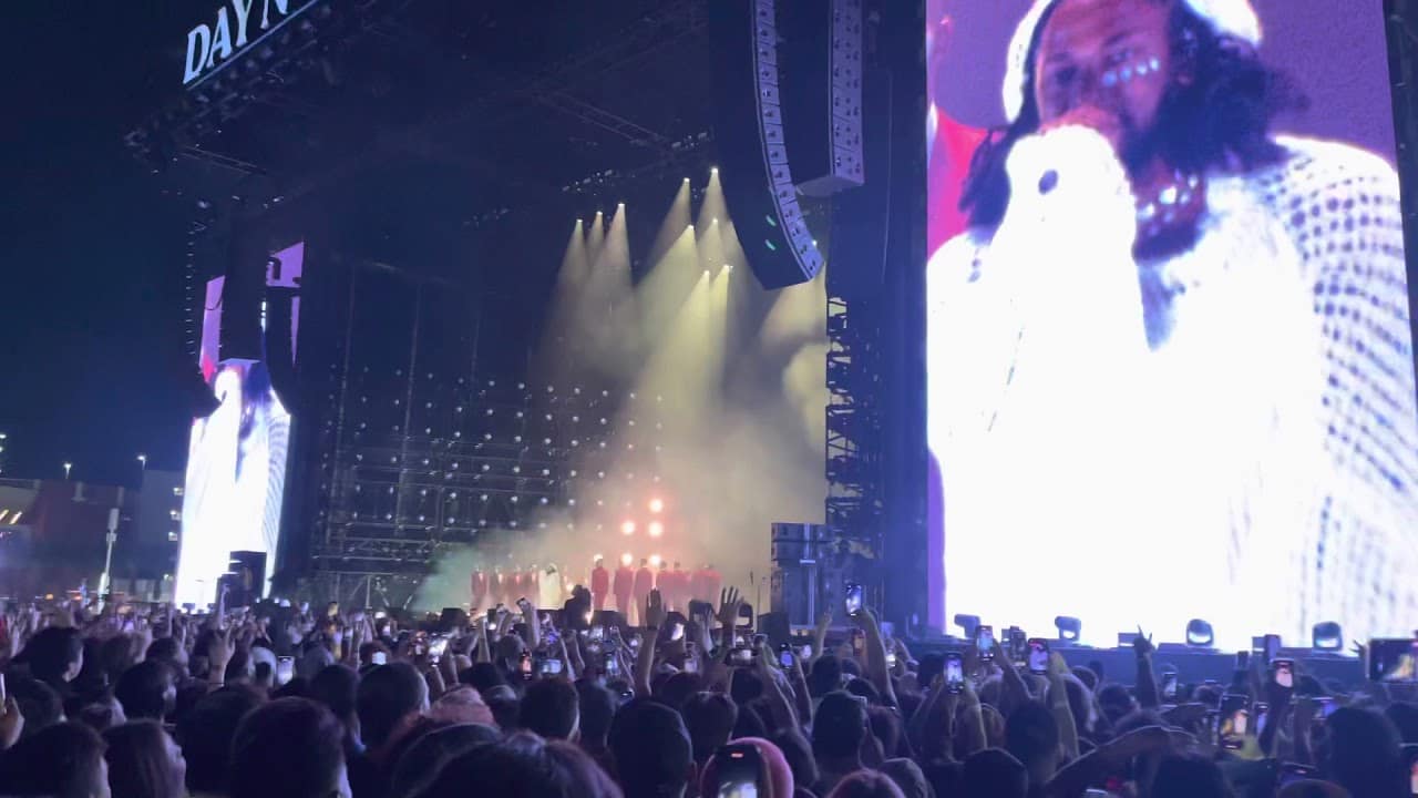 The Compton emcee took the stage wearing an all-white outfit consisting of a knit sweater with a cap containing shoulder-length braids; playing the role of a hip-hop messiah. Background performers dressed in maroon suits with white facepaint crept onto the stage as K-dot kicked off his set with the Section.80 track “F*ck Your Ethnicity”. As he worked through the 10-year old debut albums tracklist performing well-known hits such as “A.D.H.D” and lesser-known deep cuts like “Ronald Regan Era” Lamar acknowledged his absence from the spotlight. He repeated the phrase “365 days times 2 since I’ve seen you” before kicking off the second portion of the performance with the Grammy-nominated sophomore album Good Kid Maad City. Lamar fed of the energetic crowd as they chanted his hit “Backseat Freestyle” line for line, while a charming youngster took the stage and boogied to “Swiming Pools”. The retrospective theme of the performance was perfectly complemented by the imaginative atmosphere that was built thanks to stark visual cues. As Lamar would shift into a new portion of the show, the screen behind him would illuminate; displaying a few lines of text that detailed his mindset and inspiration during the album in question. Moreover, the rotating background performers that joined Lamar on stage would contribute to whatever song was playing. For instance, during “m.A.A.d City” flashlights were used to simulate a police raid coinciding with the track’s theme of corrupt law enforcement. Lamar executed pieces his Grammy-winning album To Pimp a Butterfly and began to wrap things up with tracks from his last LP 2017’s Damn, where the audience was graced with a surprise appearance from Baby Keem. The duo performed their new singles that were released earlier this year “Range Brothers” & “Family Ties”, with a few more added ad-libs that allowed their family chemistry to shine. For the grand finale Lamar performed a soft-spoken rendition of the epic Good Kid Maad City track “Sing About Me, I’m Dying Of Thirst” while the background performers gathered behind him posing in family portrait style.