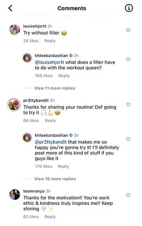 Other comments referred to the filter she used for the video. “Try without a filter ?”, another user wrote, to which Khloé responded, “what does a filter have to do with the workout queen?”