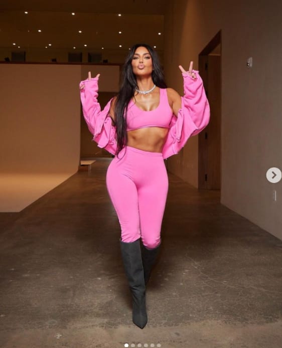 Kim Kardashian is known for her bold fashion choices and her recent all-bubble gum pink outfit was no exception. The reality TV star and business mogul was seen wearing pink leggings with a matching sports bra as a top, paired with a cropped hoodie in the same shade. She completed the look with knee-high black boots and a diamond necklace.