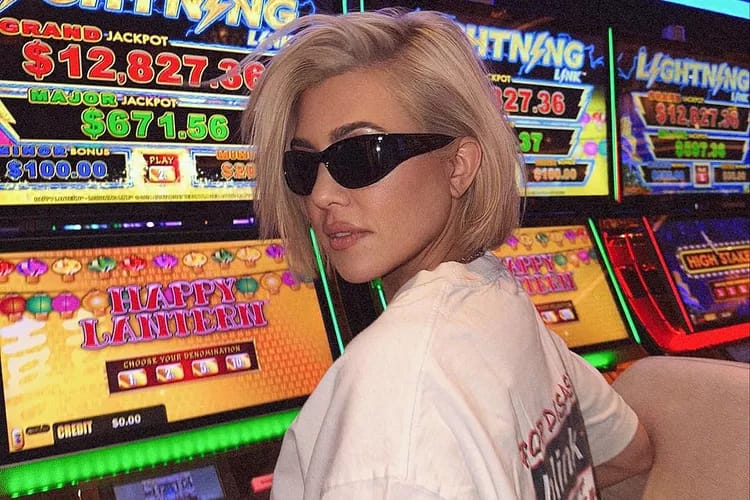 In a series of Instagram photos that referenced Hunter S. Thompson’s classic book Fear and Loathing in Las Vegas, the Kardashians star flaunted her new blonde hair while posing next to a slot machine. Kourtney is sporting dark shades and a Blink-182 T-shirt, the band that her husband Travis Barker is in.