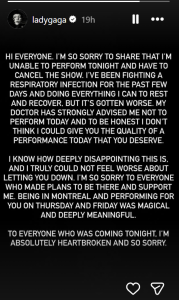 Lady Gaga calls off her Montreal performance due to a respiratory infection, prioritizing her health after days of illness