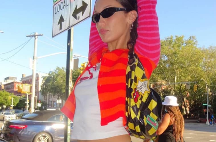 Bella Hadid stops traffic in NY wearing Betsey Cab Co Shoulder Bag Black Multi in September, 2021. We love how she accentuated the bag with a colourful cardi and flouncy skirt. This is the ultiamte Y2K-inspired look!