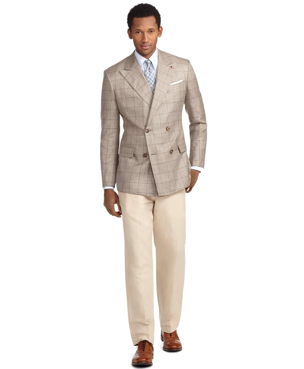If you really want to stand out from the crowd at more formal events, opt for a double-breasted jacket. We like this linen and wool sport coat from Brooks Brothers. The check pattern, tortoiseshell buttons, and peak lapels give it an air of distinction.