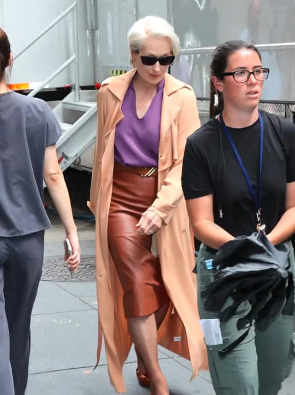 On location in Manhattan, Streep was spotted embodying Miranda in full regalia: a lavender blouse tucked into a high-waisted leather pencil skirt, topped with a tan trench and oversized sunglasses. Her platinum pixie cut is immaculately styled—a direct visual callback to the character she defined in 2006.