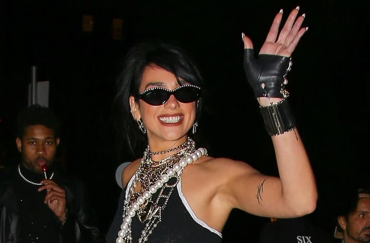 With her layers of accessories on top of a sports bra, cycling shorts, and tights, Dua Lipa represents the brand of the evening.