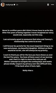 The pair have not claimed what caused the seemingly sudden split, although there are some theories floating around online that Tommy may be to blame since Molly’s post stated the below: