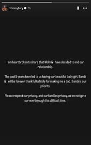 Update: Molly Said: “Never in a million years did I think I’d ever have to write this. After five years of being together I never imagined our story would end, especially not this way. I am extremely upset to announce that mine and Tommy’s relationship has come to an end. I will forever be grateful for the most important thing to me now and always, my beautiful daughter. Without us there would be no her, she will always be my priority.”