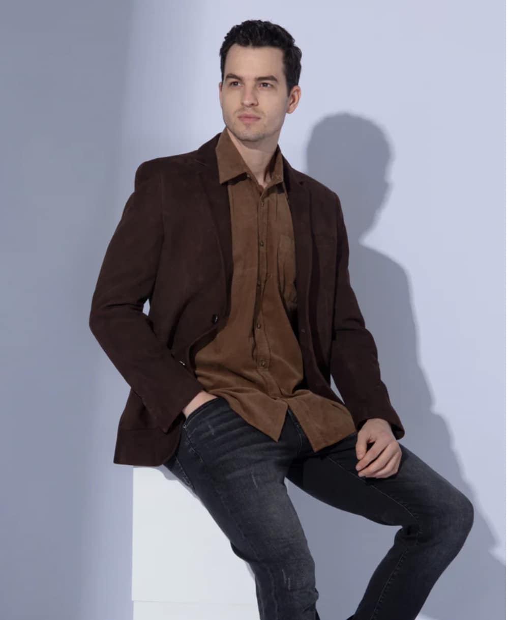 3. Brown Classic 2-Button Suede Leather Blazer