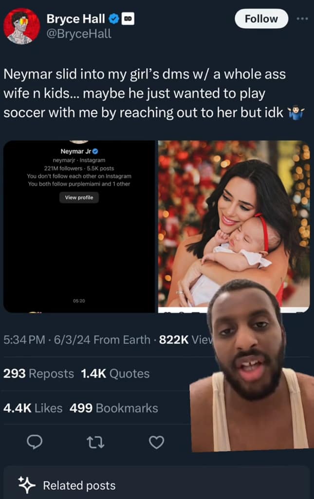 Neymar allegedly slid into Bryce Hall’s girlfriend’s DMs with “a whole a*s wife and kid.”