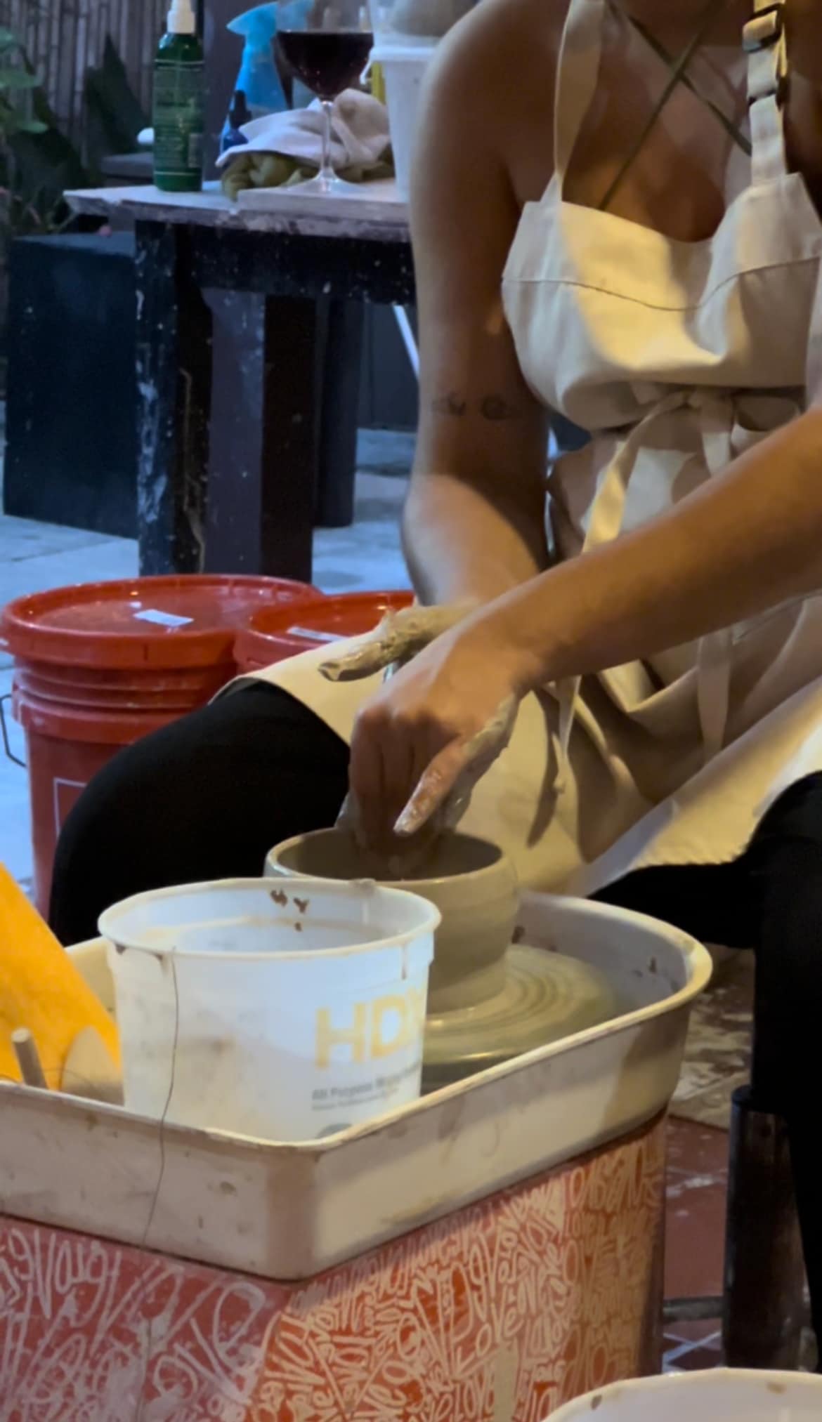 Living in a fast-paced city like Miami can become overwhelming at times, and I yearned for a hobby that encouraged me to slow down and focus on a single absorbing activity. As I began to research my options, I came across OCISLY Ceramics, an oasis in the heart of Wynwood. OCISLY Ceramics was born during the height of the pandemic when founders Cristina and Adam became passionate about the craft after needing to fix a handmade family heirloom. The couple decided to open Casa Mida, a gorgeous backyard pottery studio where experienced wheel throwers, creatives, and pretty much anyone curious about pottery could vibe out to music while making one-of-a-kind pieces together.