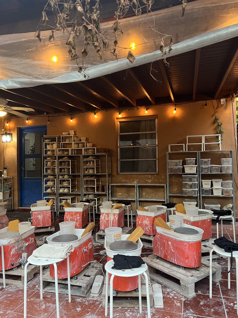 Walking into Casa Mida was truly like stepping into an oasis. The backyard is a large tranquil space boasting beautiful fruit trees, bohemian hanging planters, romantic patio lights, and shelves filled with gorgeous hand-made ceramics. As I entered the space, I was greeted by the rest of my classmates, some of whom were relaxing on the patio enjoying a bottle of wine (BYOB is highly encouraged at OCISLY), and our instructor Deb who has over 9 years of experience with ceramics.