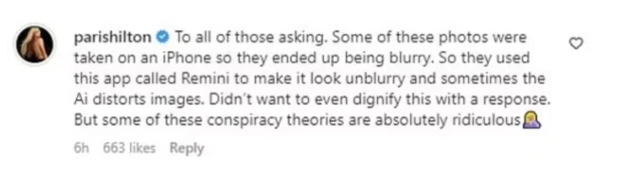 “To all of those asking. Some of these photos were taken on an iPhone so they ended up being blurry. So they used this app called Remini to make it look unblurry and sometimes the Ai distorts images. Didn’t want to even dignify this with a response. But some of these conspiracy theories are absolutely ridiculous.”