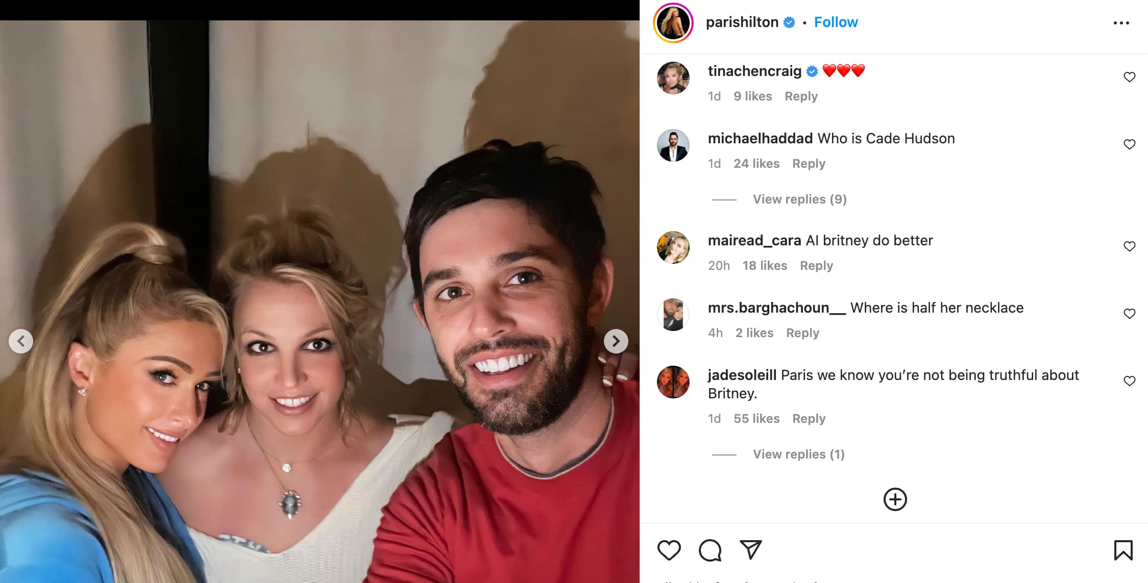In the slide of pictures shared, a photo of Paris, Britney Spears and Cade Hudson was posted which had people turning their heads. The post received comments like, “AI Britney do better” and “Paris we know you’re not being truthful about Britney.” Insinuating Britney was photoshopped into the photo for clicks.