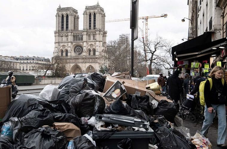 As a striking visual representation of opposition to Mr. Marcon’s Bill raising the retirement age from 62 to 64, trash mounds of up to 10,000 tonnes along the streets of the French capital.