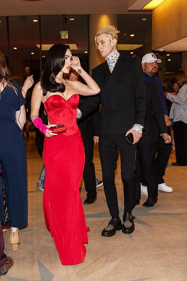 Megan Fox and Machine Gun Kelly attended last night. MGK is in a black suit with a bejewelled shirt underneath. Megan Fox looked fantastic in a red floor-length dress and a highlighter pink wrist brace.