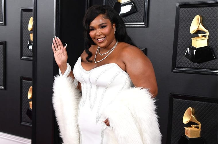 Lizzo arrives to the red carpet in a snow-white custom Versace dress embroidered with Swarovski Crystals.
