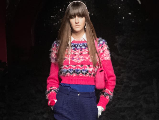 Some of our favourites from the collection include multi-layer looks that highlight some of Chanel’s most desirable pieces. For instance, 90’s-inspired cropped tweed blazers in bold colours give the collection a more sensual feel, while houndstooth printed sets are reworked for a more oversized fit to give the collection more shape and dimension. One of our favourites though involves branded quilted overalls that are very ski chic.