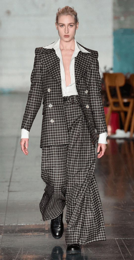 This look is both mixed with tradition and breaks boundaries. The female model is wearing a classic checked pattern suit, although the jacket is form fitting to her silhouette, the trouser is oversized and flares out which is both a female trait in fashion, but brings in more masculinity because the garment is more male-oriented.