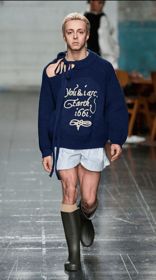 This look may just make you think of an old English sailor, but truly this look is something that breaks those gender norms. The classic look of masculinity is still there with these pieces but accentuates the feminine side. The knit jumper having an open shoulder with a long tie is classic to female garments, while the boxer shorts are not only revealing but show more skin in the overall look, bridging the gap between masculine and feminine.