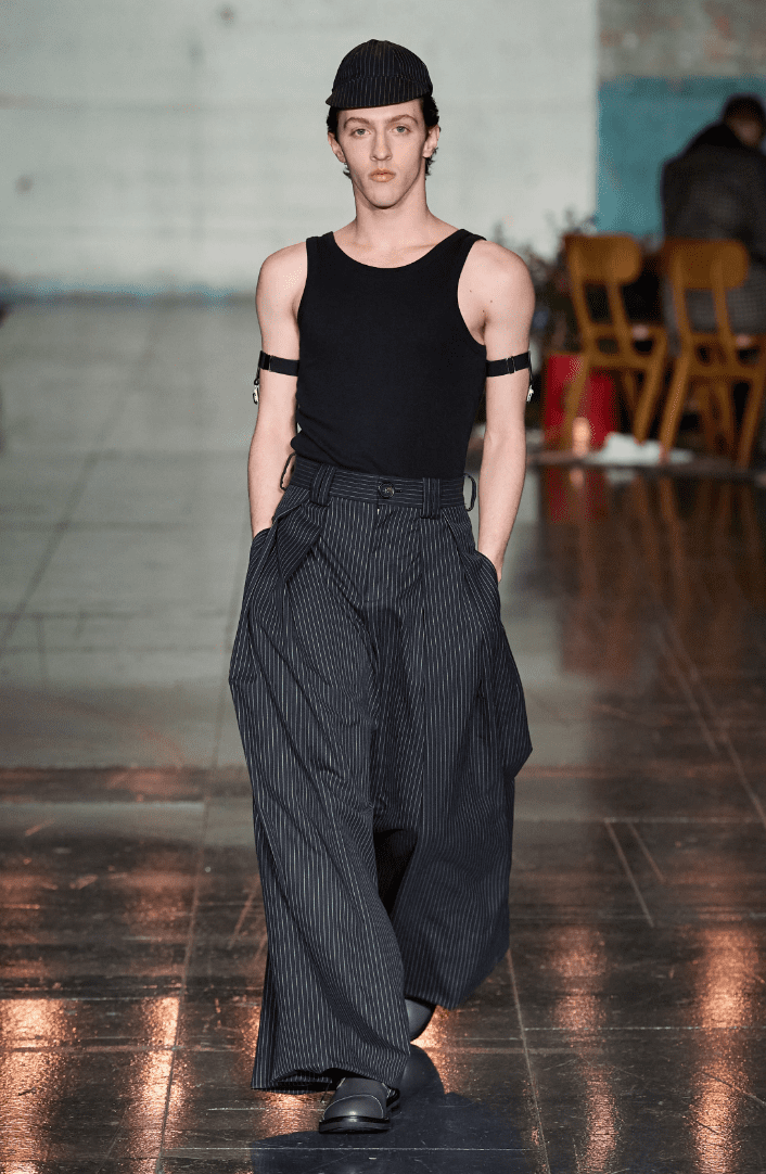 The young actor is wearing ultra-wide leg, double-pleated black pinstripe trousers, and pairing it with a classic black tank top accented with a hat that matches the pinstripe trouser. The cut of these pants is the main focus of the piece from Daley, showcasing a trouser with such flare that in a traditional sense a woman would be the one to wear them.