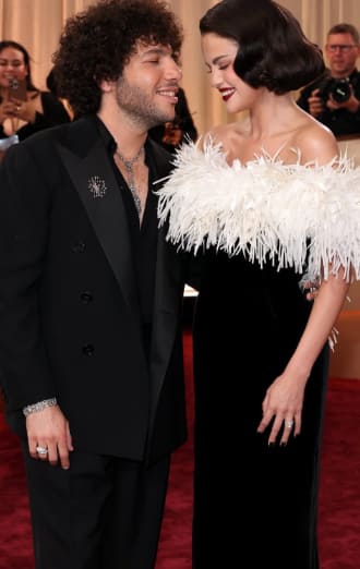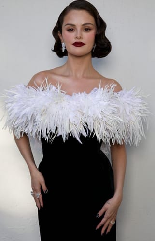 Selena stunned in a dramatic black gown adorned with a white feathered neckline, channeling timeless Old Hollywood sophistication. The structured silhouette and soft detailing created a red carpet moment that felt both vintage and modern—an effortless balance Gomez has mastered.