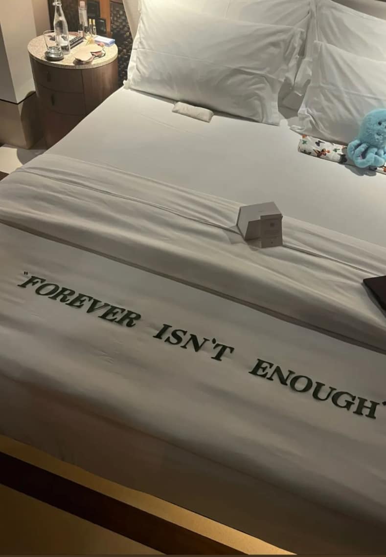 Sofia posted this photo of the hotel room on Instagram, the duvet inscribed with ‘Forever Isn’t Enough.’