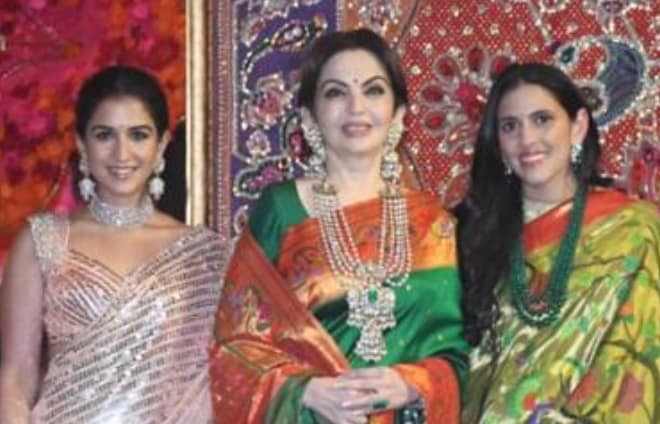 Host Nita Ambani looked regal in her green and red saree and gold jewelry. She joined her daughter-in-law Shloka Mehta and to-be-daughter-in-law Radhika Merchant for a photo op outside their home.