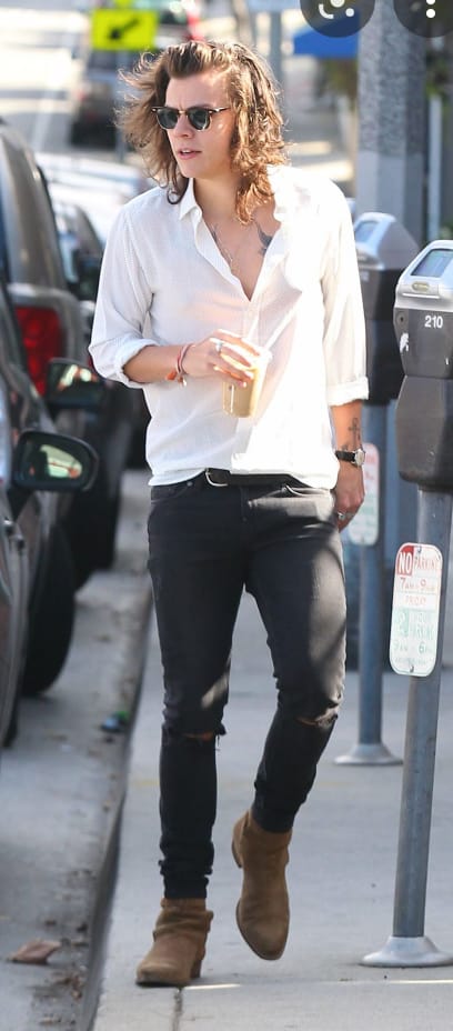 In those early YSL days, Harry sure knew how to keep a crowd pleased, with the help of his stylist Harry threw on the same Paige jeans, and the same brown boots and swapped them out for a black or white t-shirt. This was a look where every girl started to fall for the curly-headed kid in the boy band.