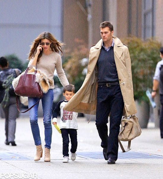 Brady joins his Brazilian model wife, Gisele Bündchen on the street. The mix of casual and formal is apparant starting from the shoes. The shoes are black leather with a rounded edge. He is wearing a navy blue pants with flared bottoms, a black buckle-less belt, and a purple shirt and a grey v-neck sweater, both tucked in. The quarterback completes his look with a nude trench coat with a matching handbag to add some spice to his outfit. The matching top by his wife is a match made in heaven.