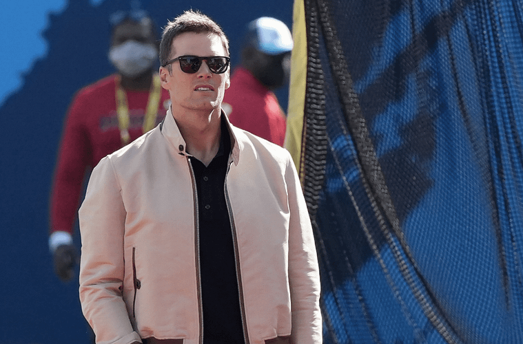 Brady steps forward with his left foot and looks fresh on the street. He is wearing blue washed skinny jeans perfect for casual wear. It looks like Brady is in love with the beige colour as he can’t get enough of it. He walks with the colour he seems obsessed with according to his previous fit. The athlete finalizes his look with a grey knitted sweater and a navy blue harrington jacket.