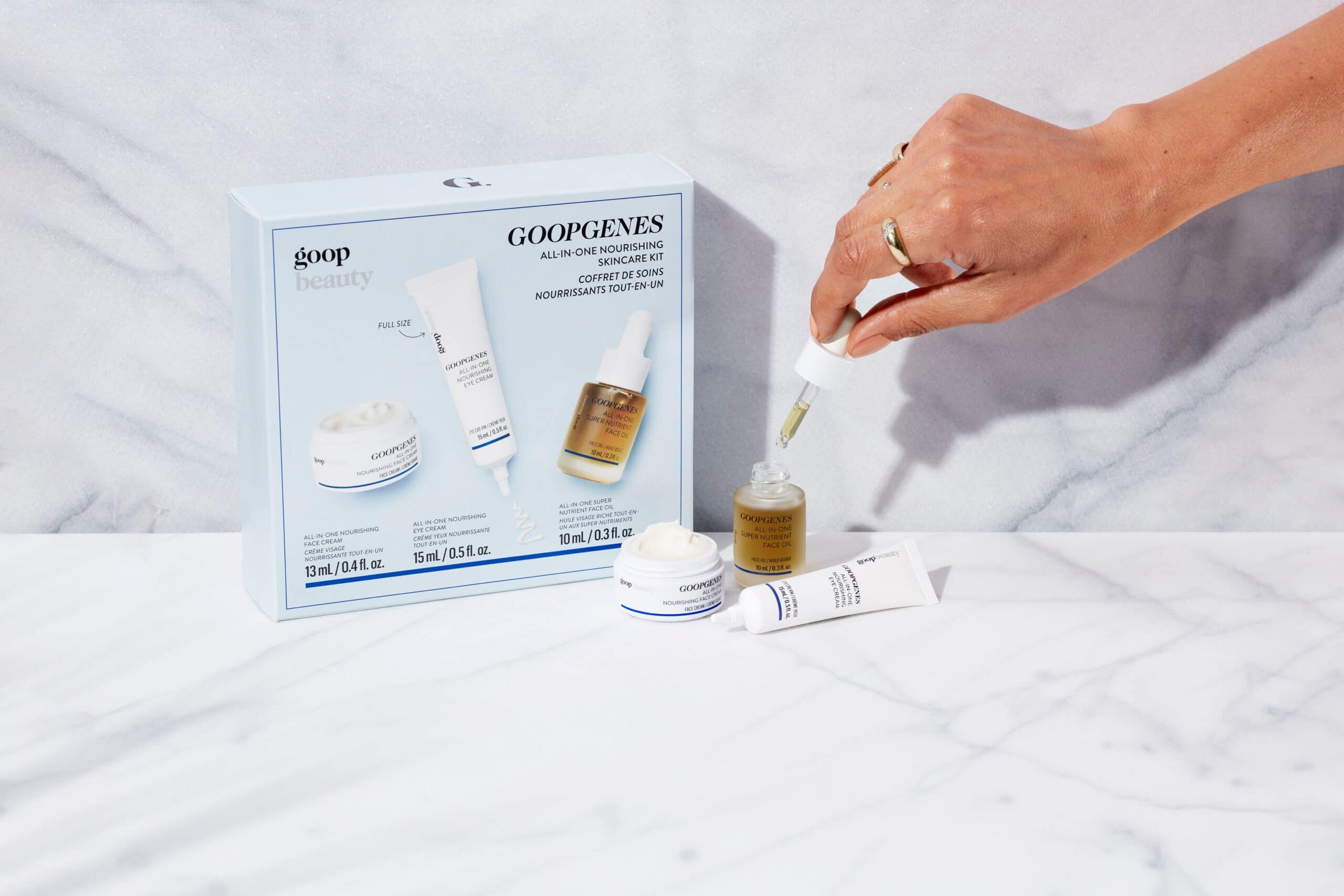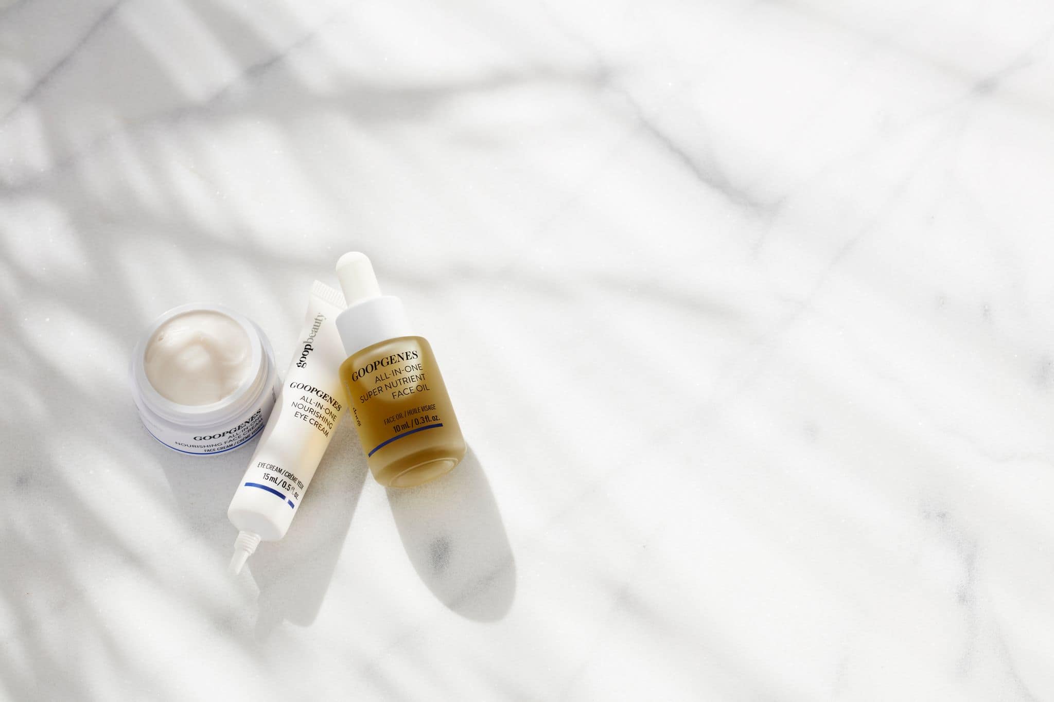 GOOPGENES has 3 main products, all-in-one face cream, all-in-one eye cream and all-in-one face oil, and all starting at $110 for the 3 piece kit!