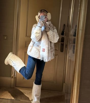 The standout theme across the carousel: comfort with structure. Sweeney paired classic blue denim with chunky sweaters, sherpa jackets, and neutral staples — showing how small styling tweaks can make winter basics feel intentional.