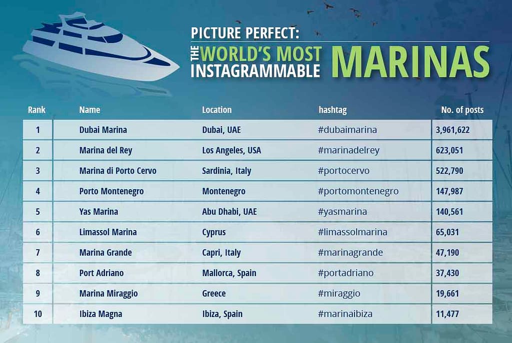 According to the findings, the top 10 most Instagrammable marinas are as follows: