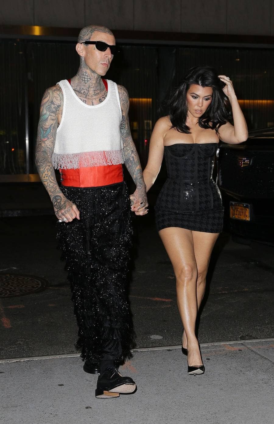 Soon-to-be brother-in-law, Travis Barker might have gone from security guard to genie in a bottle, a very off-brand look for the very tatted rock star, a cropped top, a sashed belt and MC Hammer meets Aladan jewelled pants.