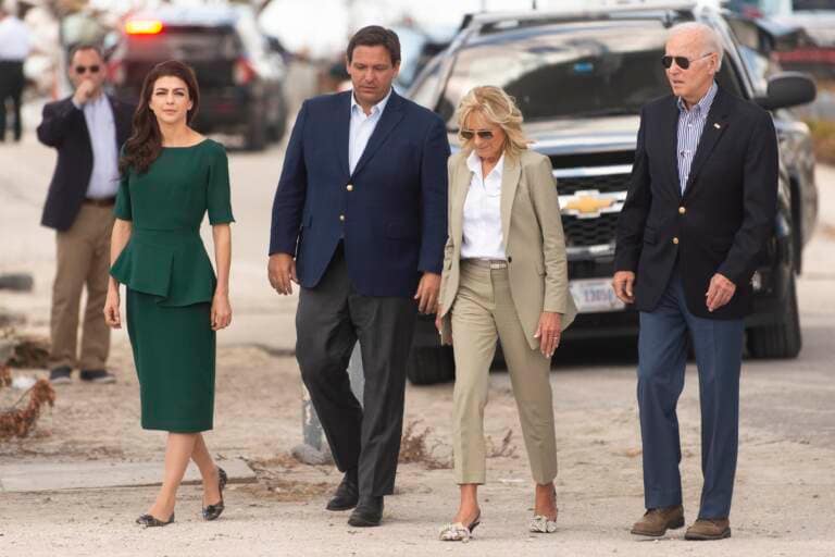 From left, Florida’s first lady Casey DeSantis, Gov. Ron DeSantis, first lady Jill Biden and President Joe Biden arrive at Fort Myers Beach, Fla., Wednesday, Oct. 5, 2022, to survey the damage caused by Hurricane Ian. (Saul Young/Knoxville News Sentinel via AP, Pool)