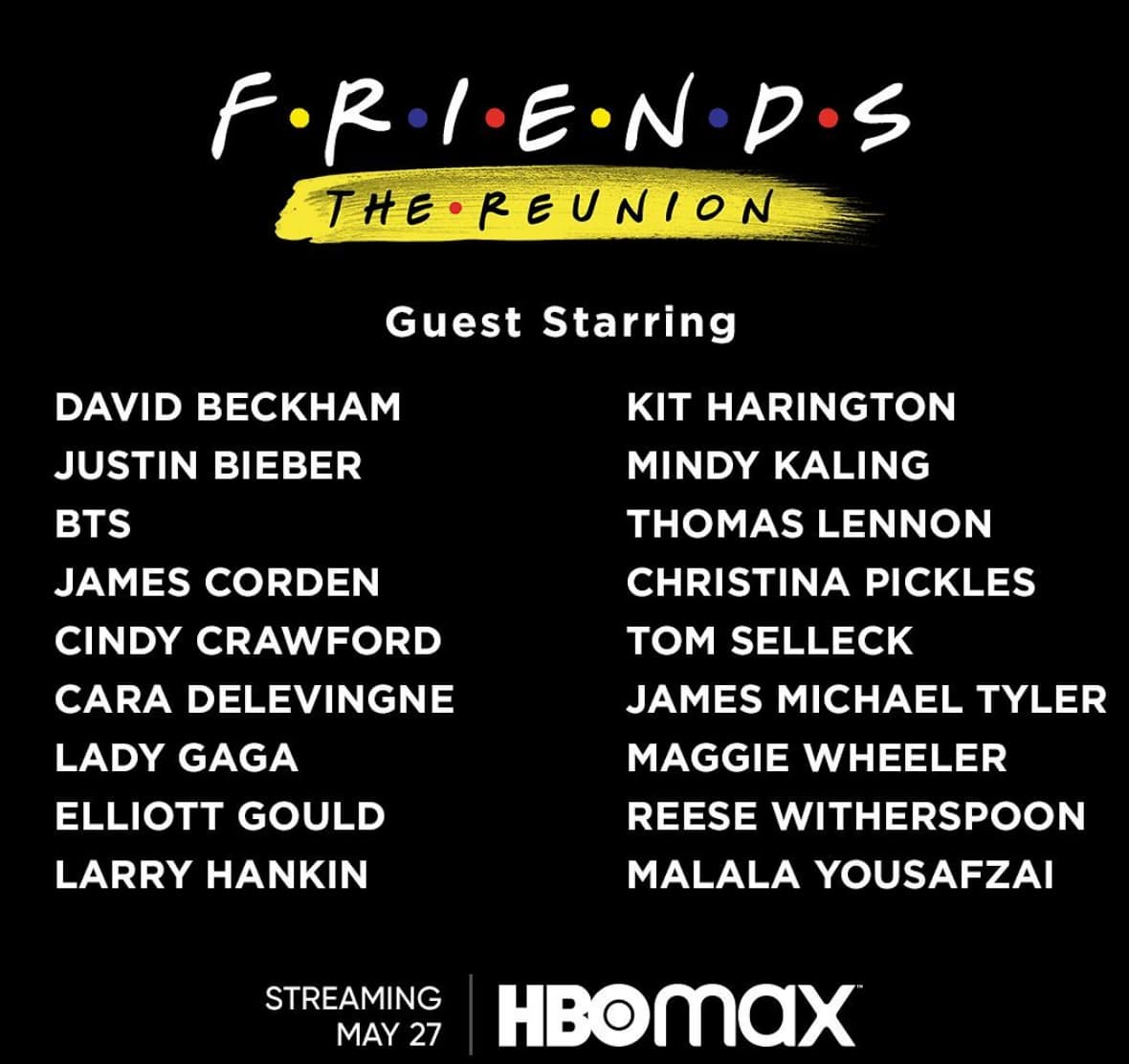 On May 14th the Friends Instagram released a teaser trailer of the cast walking hand-in-hand on the Warner Brothers lot, with the captions “The One Where We Get to See Our Favorites Back Together Again. The #FriendsReunion is coming on May 27 only on @hbomax.” Right after this post, they posted a long list of 18 guest stars that include Lady Gaga, David Beckham, Reese Witherspoon, Mindy Kaling and many more.